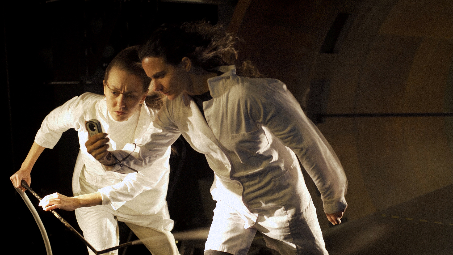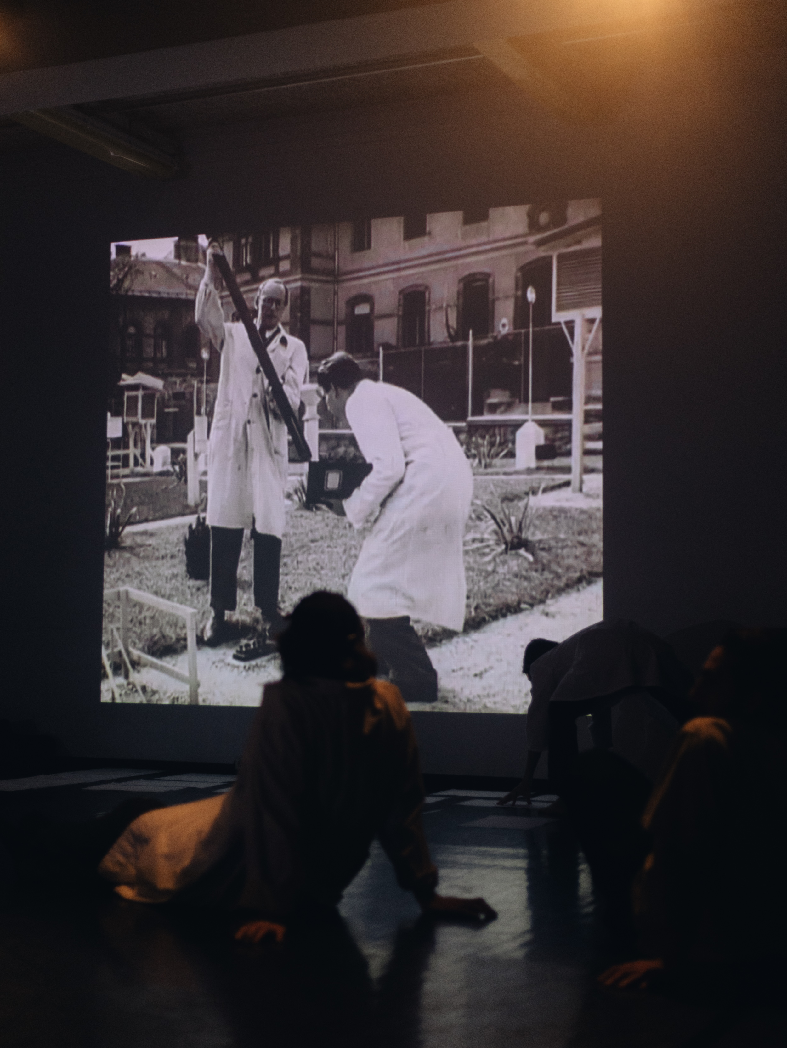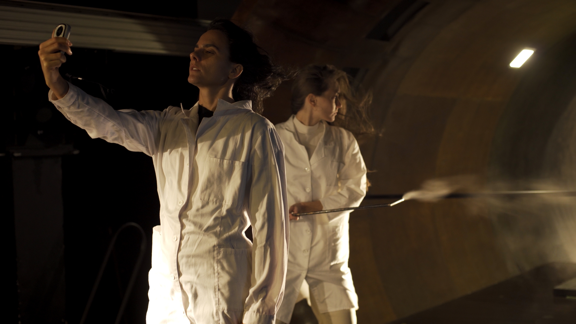 Wearing lab coats stages “science” as a costume and performance, rather than a purely rational pursuit. The lab becomes a theater of knowledge production. Standing still inside the machine—rather than operating it—exposes the performativity of measurement: that science is not only about precision but also about gestures, authority, and symbols.