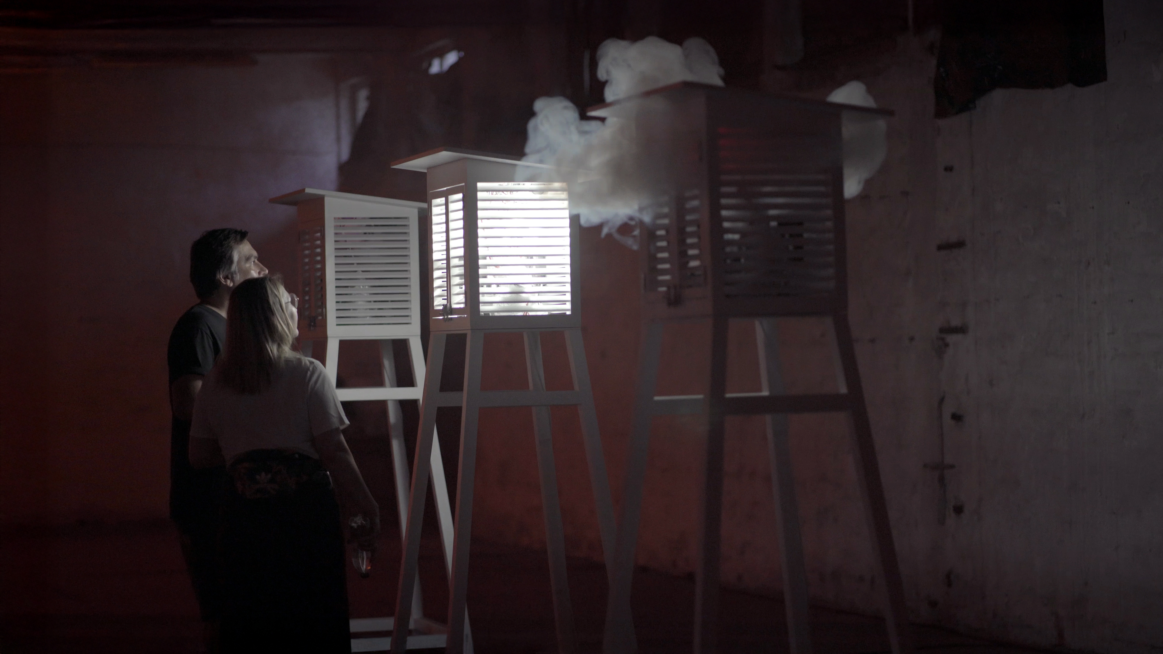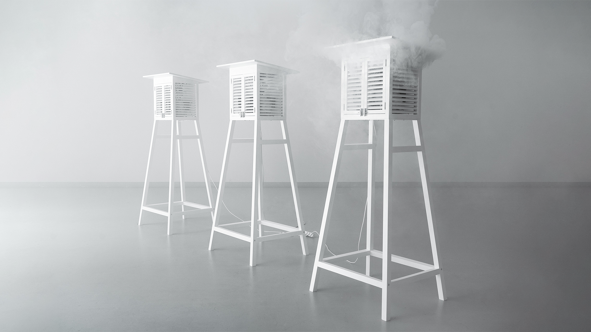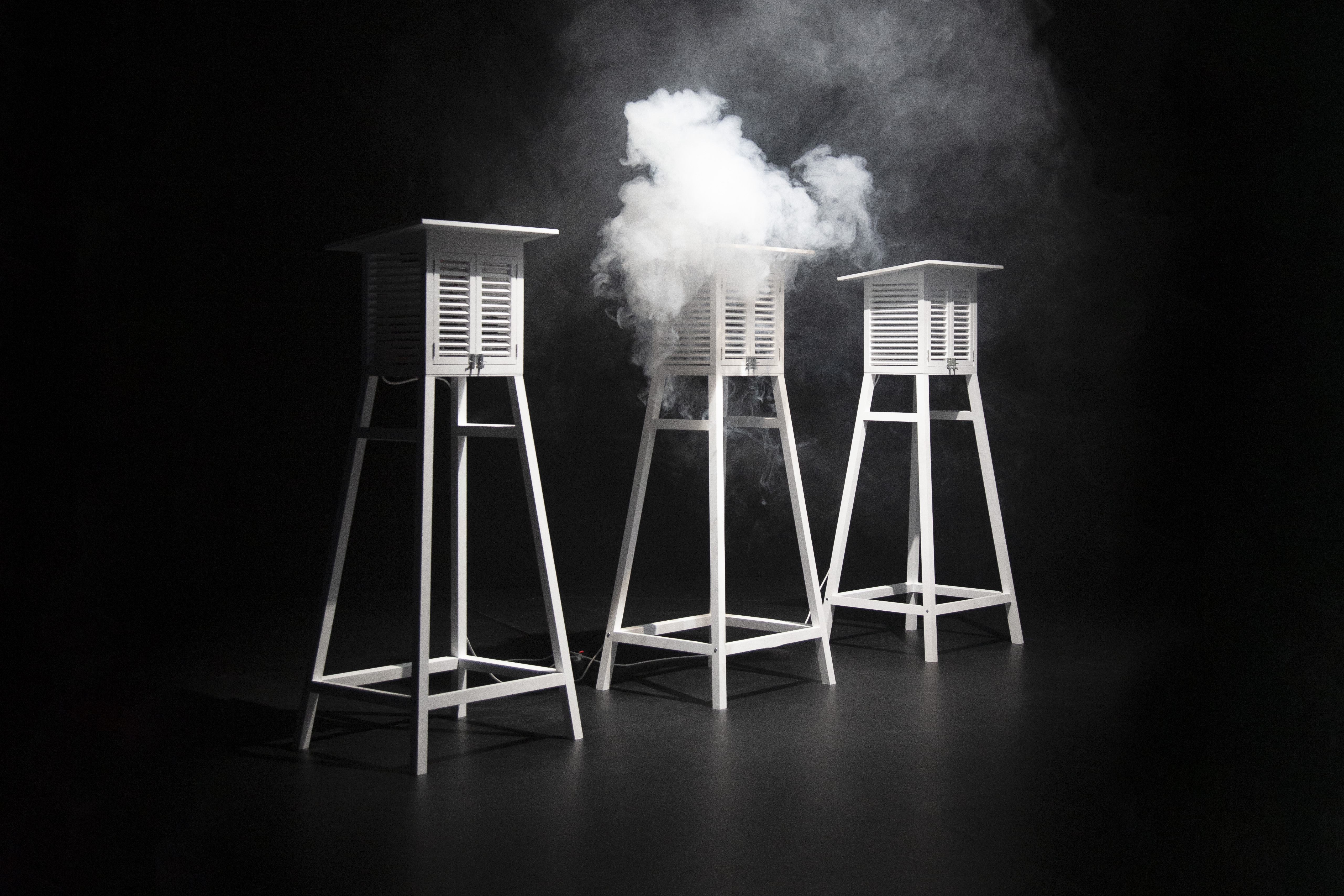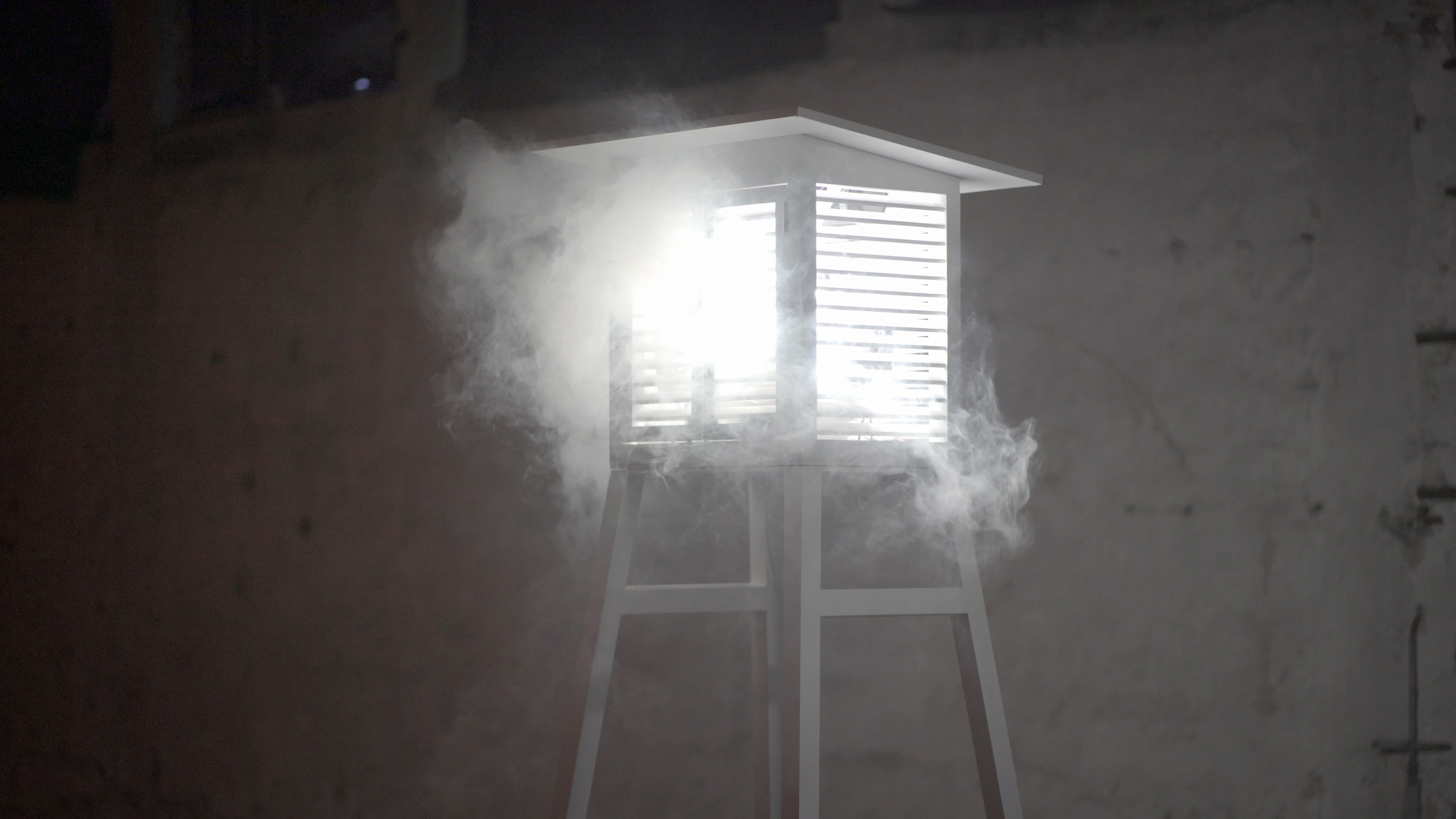 installation, 2024The installation features three classical weather instrument shelters, but instead of housing measuring devices, an artificial storm rages inside. The installation suggests that the act of measurement itself can influence the system being observed, as much as it underscores the subjectivity inherent in our understanding of complex processes like weather. The inner mechanisms are detached from the outer world, much like our beliefs guiding us. By reducing atmospheric phenomena to „good” or „bad” weather, the installation reflects humanity’s desire for order and predictability, while also acknowledging that our attitudes toward unpredictability are the only things we can hope to control.