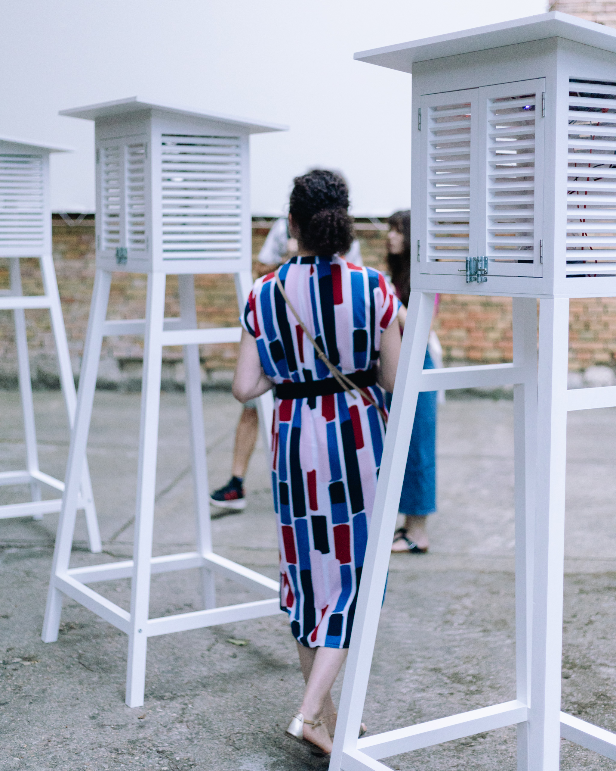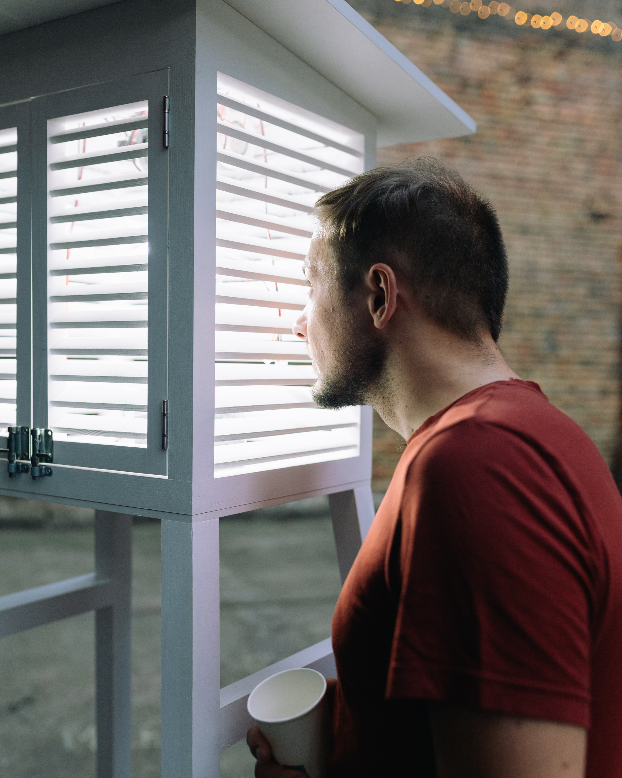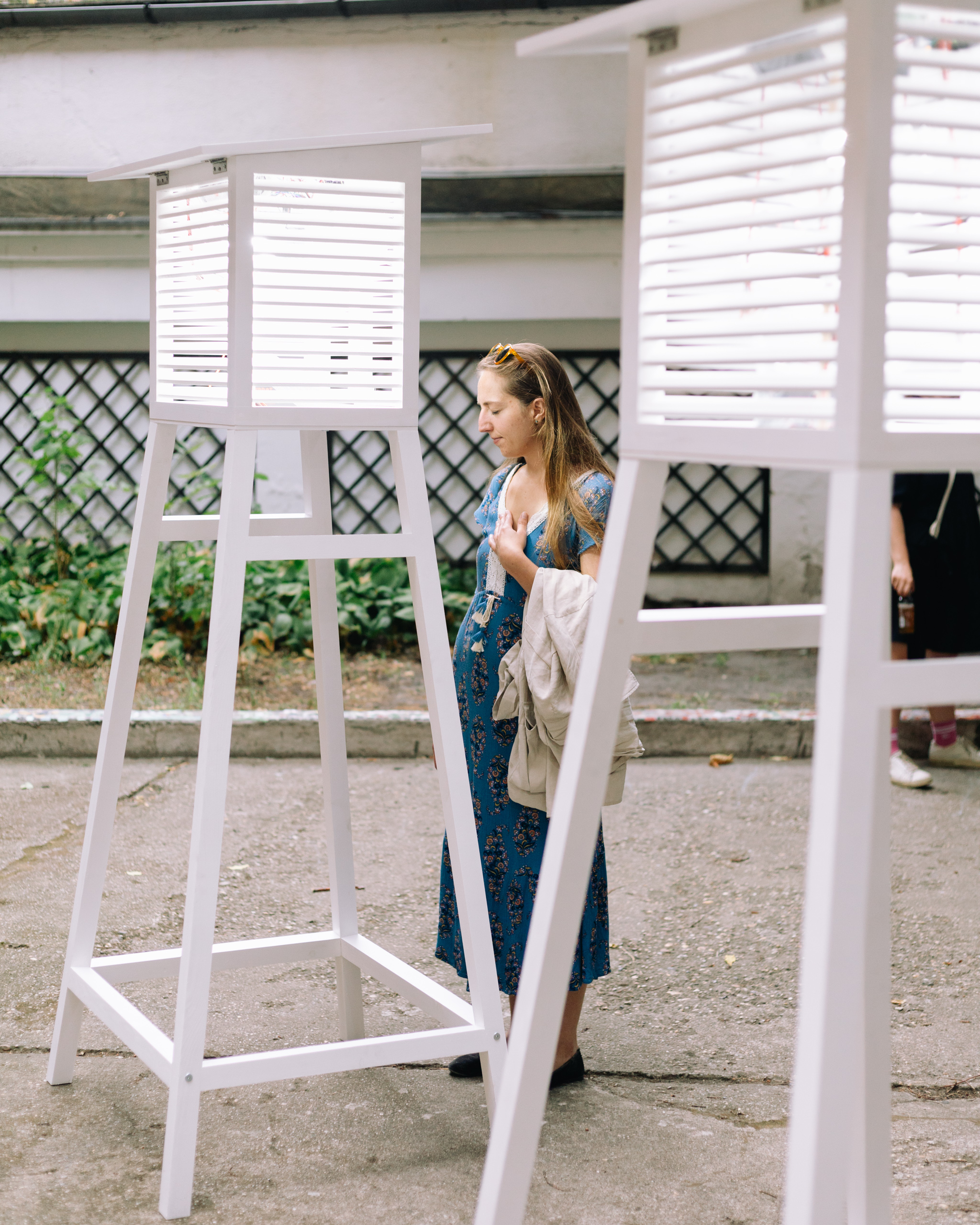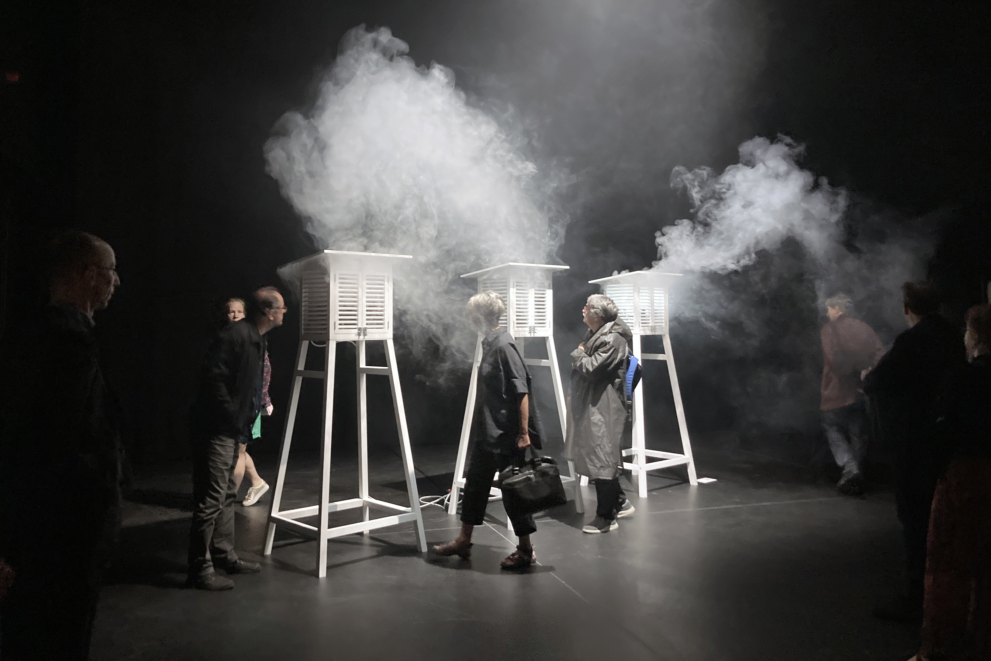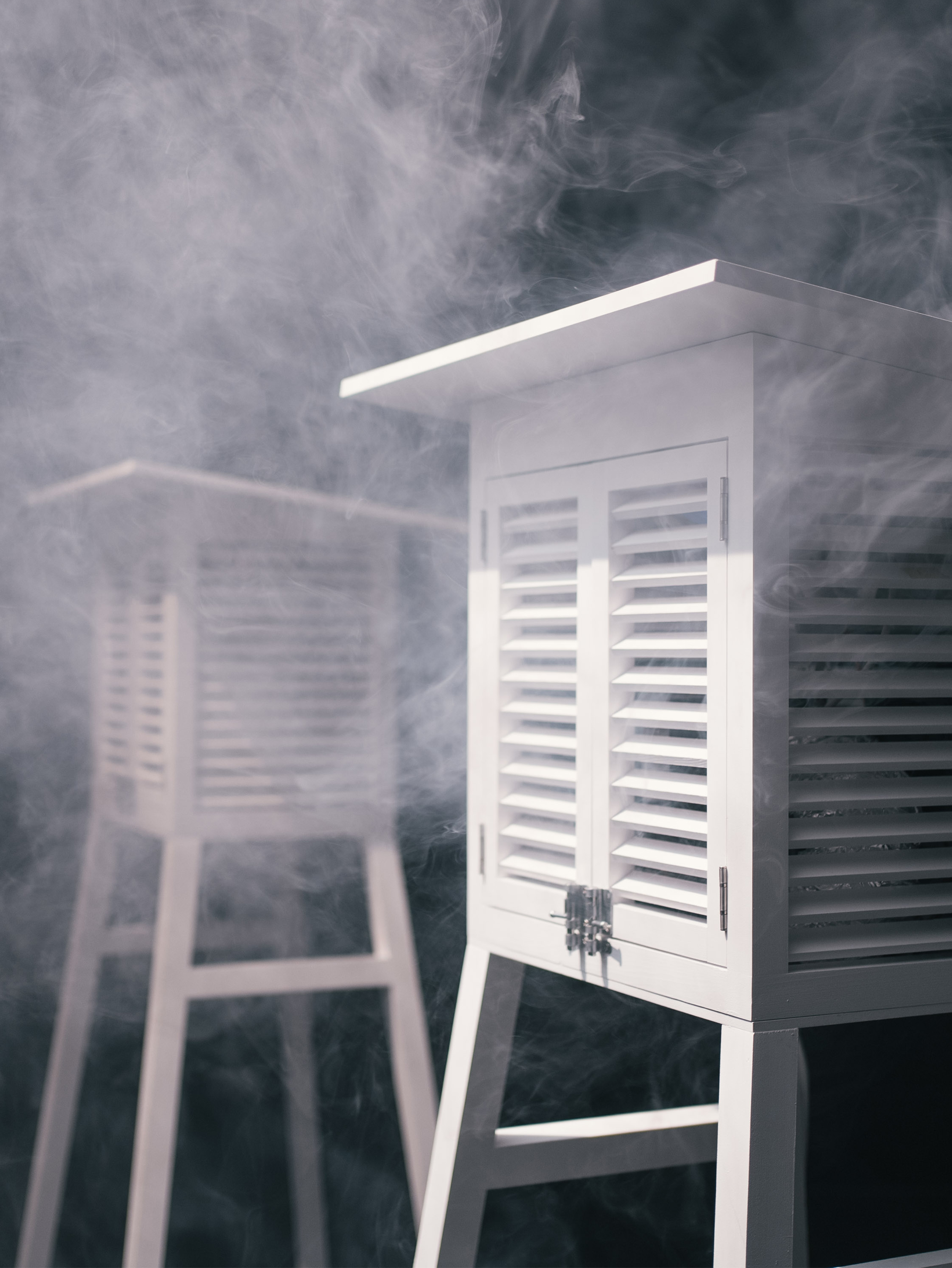 installation, 2024The installation features three classical weather instrument shelters, but instead of housing measuring devices, an artificial storm rages inside. The installation suggests that the act of measurement itself can influence the system being observed, as much as it underscores the subjectivity inherent in our understanding of complex processes like weather. The inner mechanisms are detached from the outer world, much like our beliefs guiding us. By reducing atmospheric phenomena to „good” or „bad” weather, the installation reflects humanity’s desire for order and predictability, while also acknowledging that our attitudes toward unpredictability are the only things we can hope to control.